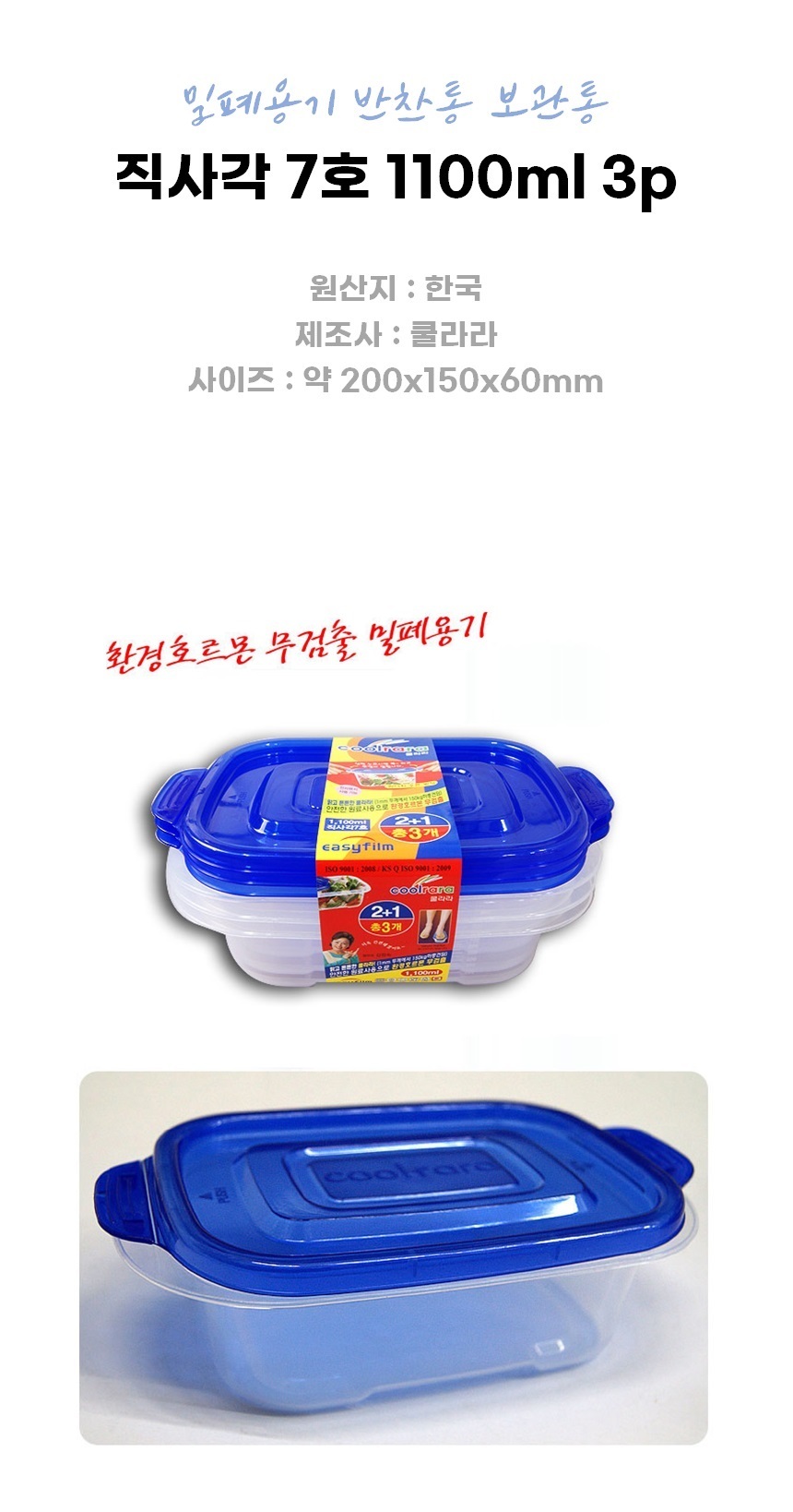 | 품명 및 모델명 | 직사각 7호 1100ml 3p 밀폐용기 반찬통 / 상세정보별도표시 |