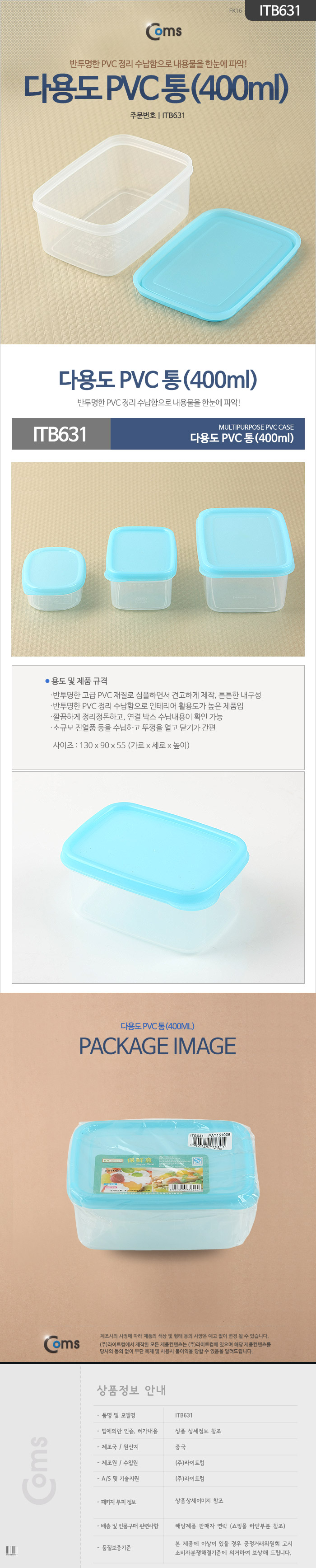 | 품명 및 모델명 | Coms 다용도 PVC 통 400ml용량 / 상세정보별도표시 |