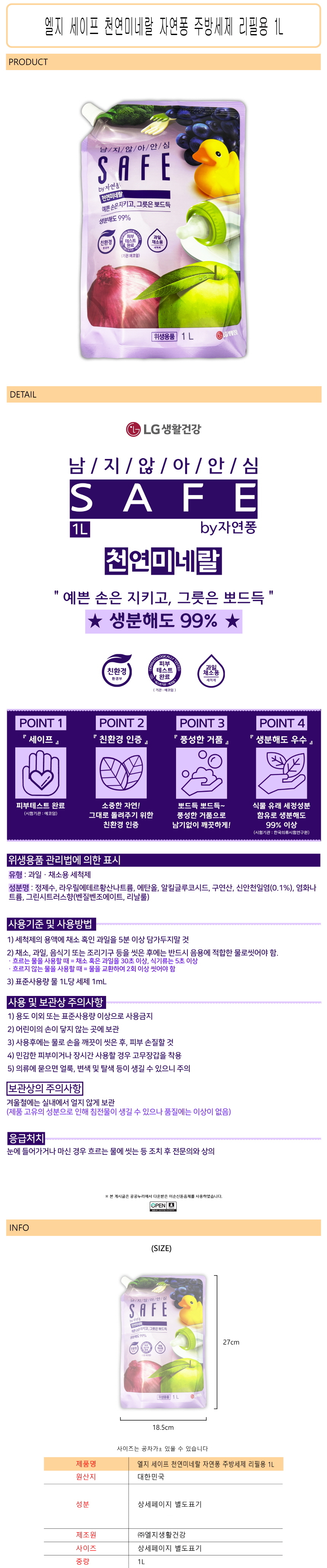 | 품명 및 모델명 | 세이프 천연미네랄 자연퐁 주방세제 리필용 1L -O / 세이프 천연미네랄 자연퐁 주방세제 리필용 1L -O |