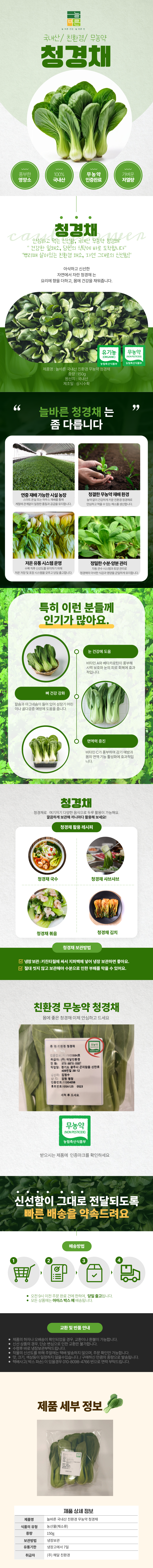 | 상품구성 | 늘바른 국내산 친환경 무농약 청경채 150g 20봉 |