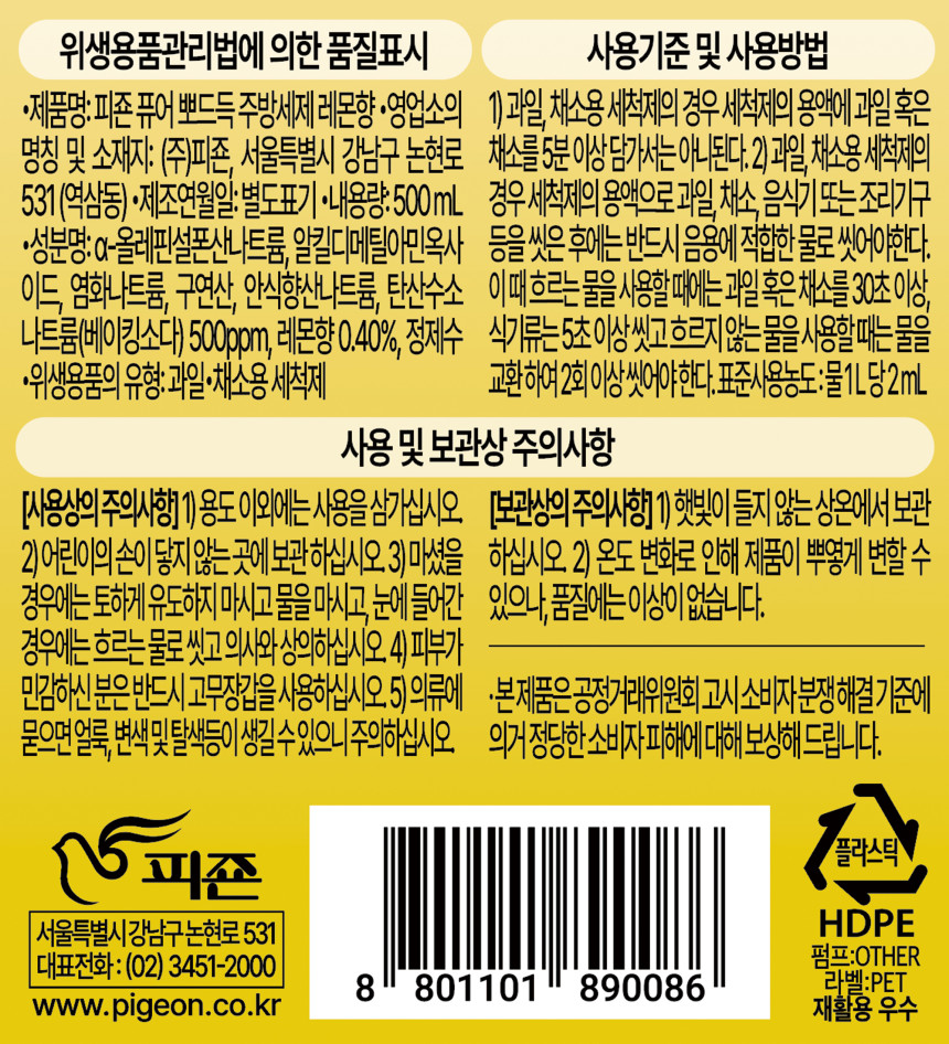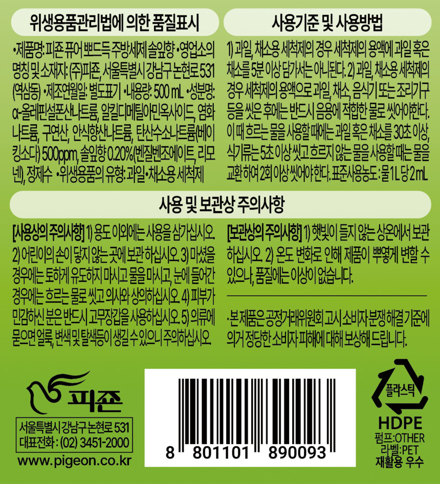 | 품명 및 모델명 | 피죤)퓨어뽀드득주방세제 500ml용기 3개입 솔잎향 / 상세정보별도표시 |