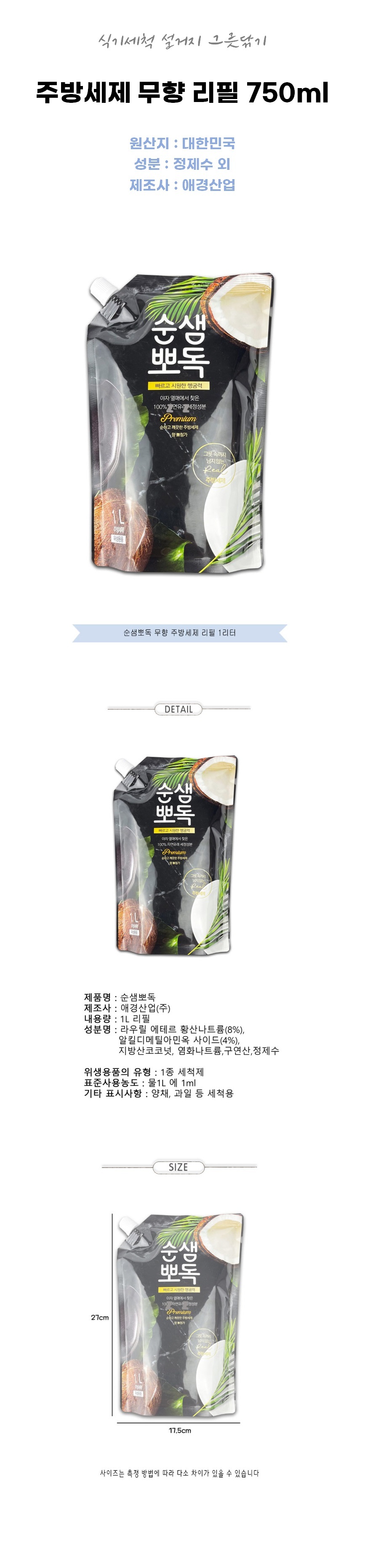 | 품명 및 모델명 | 주방세제 무향 리필 750ml 식기세척 설거지 그릇닦기 / 상세정보별도표시 |