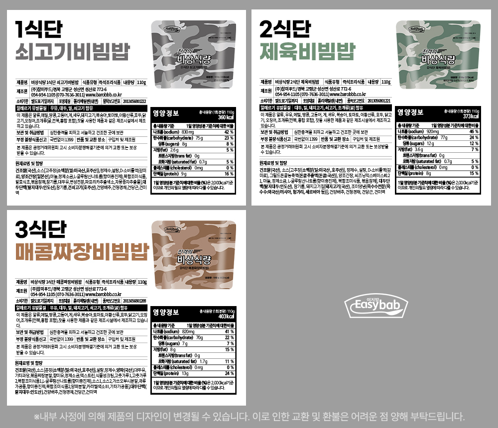 | 품명 | 비상식량 3식단 매콤짜장비빔밥 |