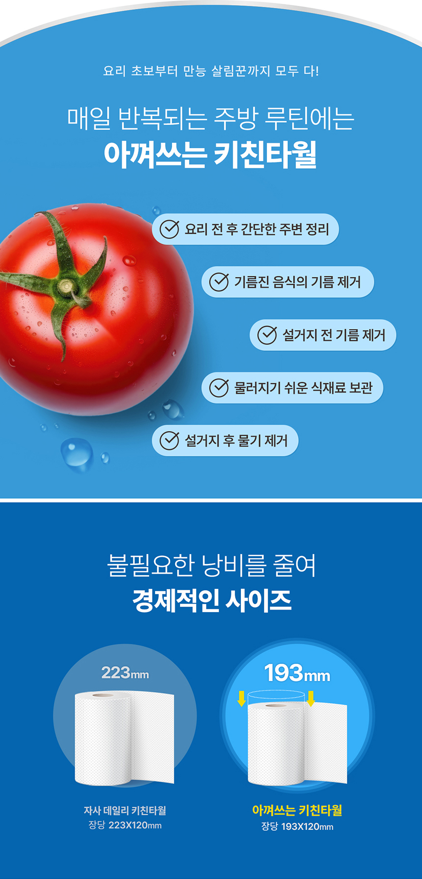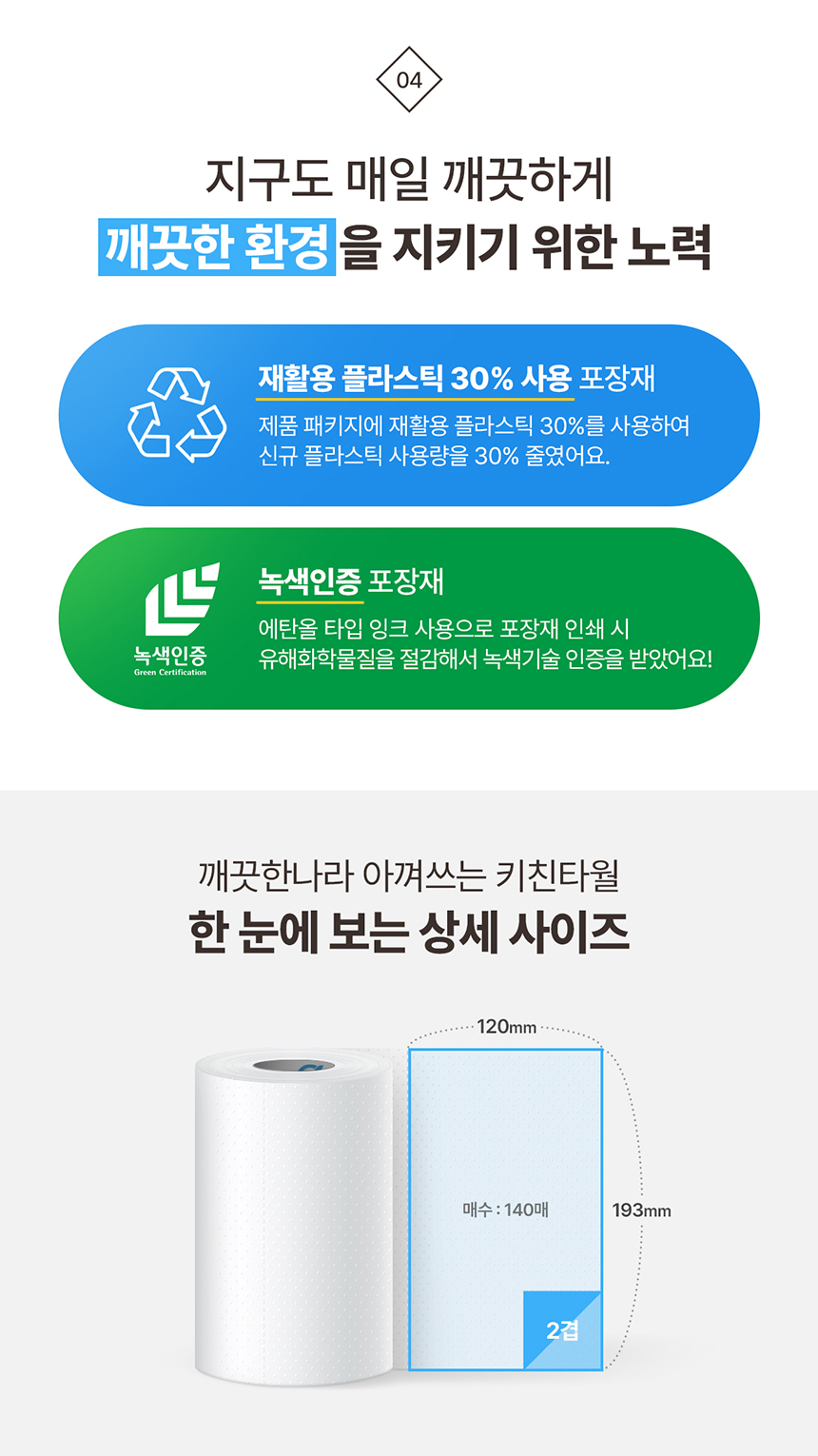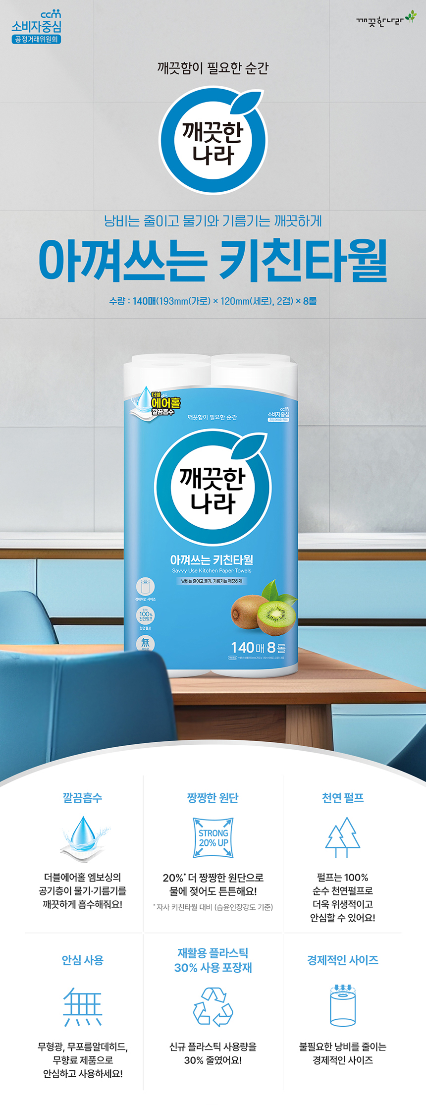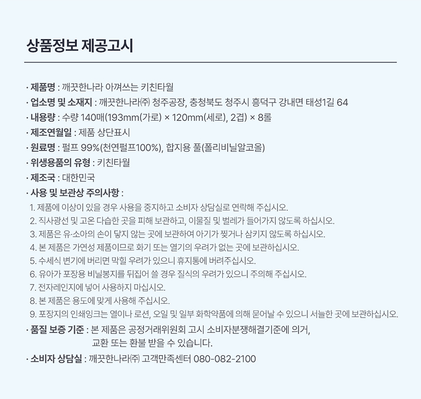 | 품명 및 모델명 | 깨끗한나라 데일리 아껴쓰는 키친타올 140매 8롤 |