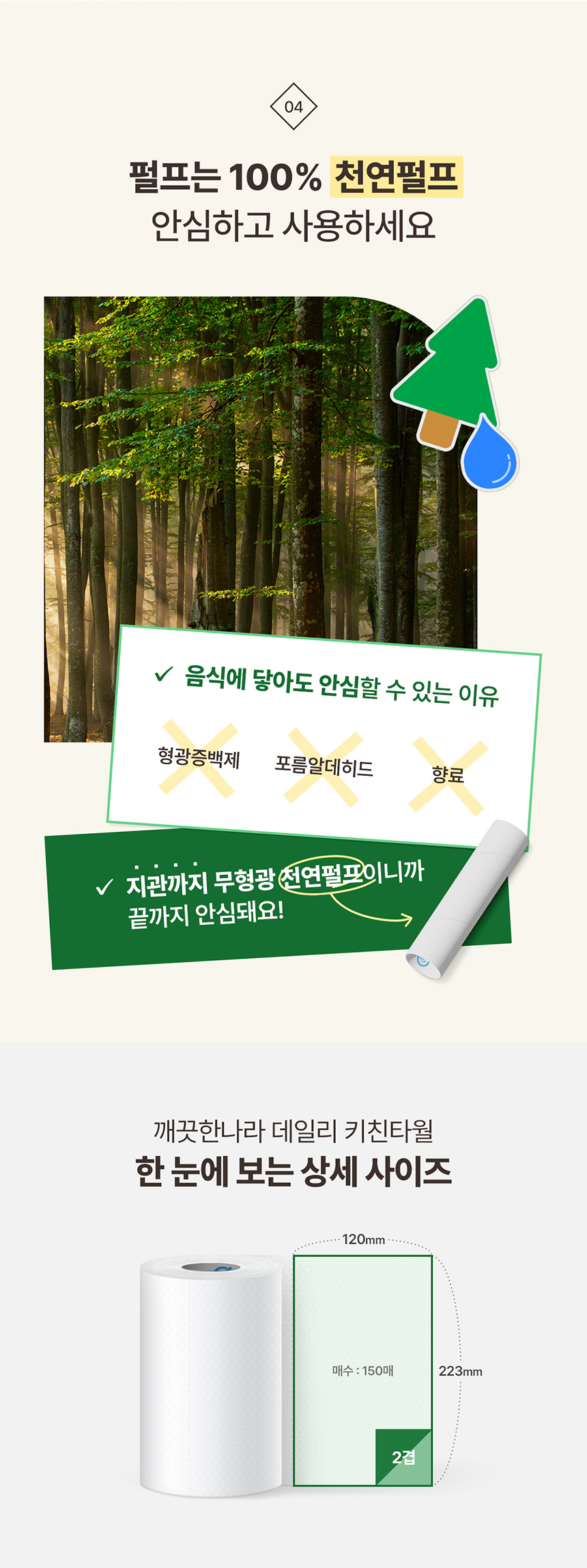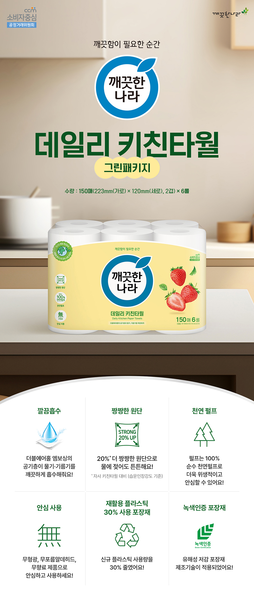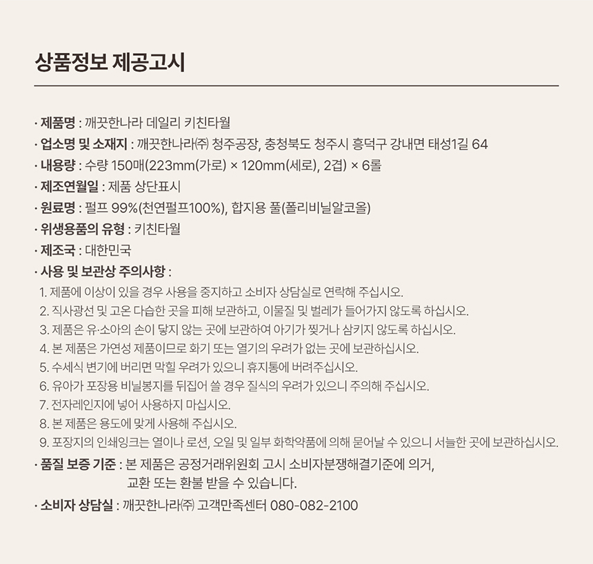 | 품명 및 모델명 | 깨끗한나라 데일리 키친타올 그린패키지 150매 6롤 |