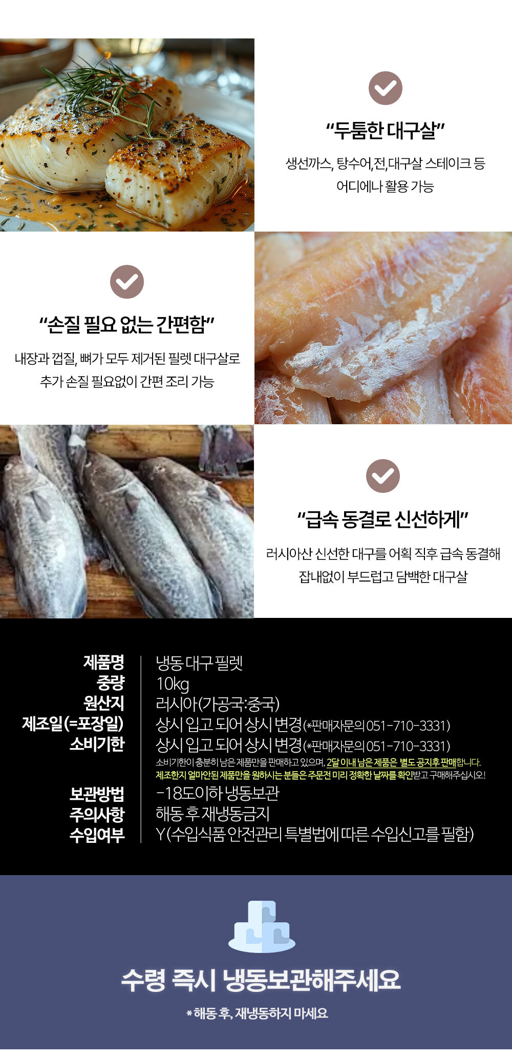 | 식품 등의 표시,광고에 관한 법뮬에 따른 소비자 안전을 위한 주의사항 | 이미 냉동된 바 있으니 해동 후 재냉동시키지 마시기 바랍니다. |