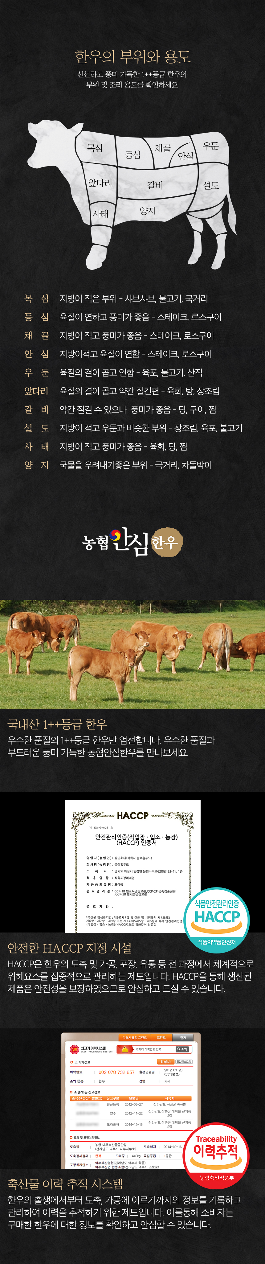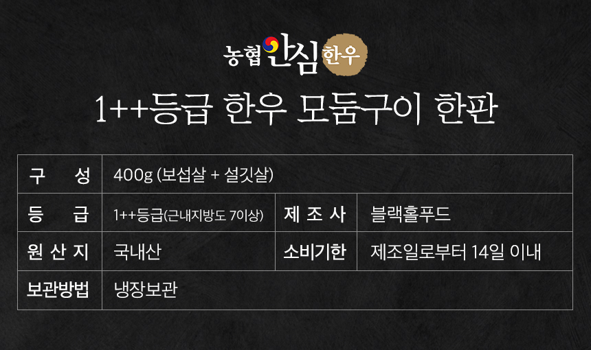 | 생산자(수입자) | 블랙홀푸드 / 경기도 화성시 양감면 은행나무로 62번길 92-41,1층 축산법에 따른 등급 표시 1++등급(7이상)/ 쇠고기 이력 추적시스템 / HACCP 인증/이력번호 표시제품으로 수령하는 고객님들이 직접 이력번호를 확인할 수 있음 |