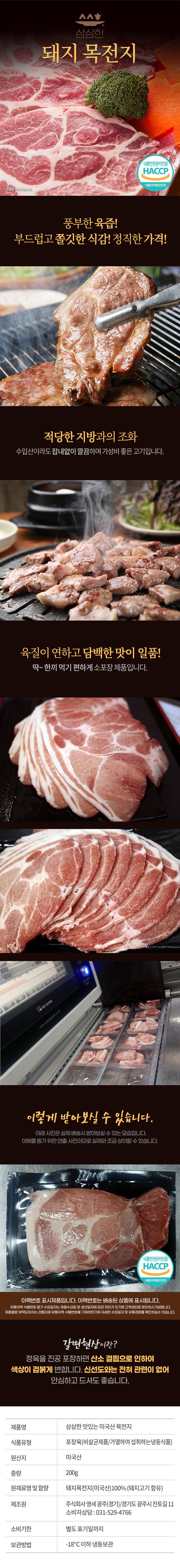 | 상품구성 | 삼삼한 돼지 삼겹살200g 3팩+목전지200g2팩 |