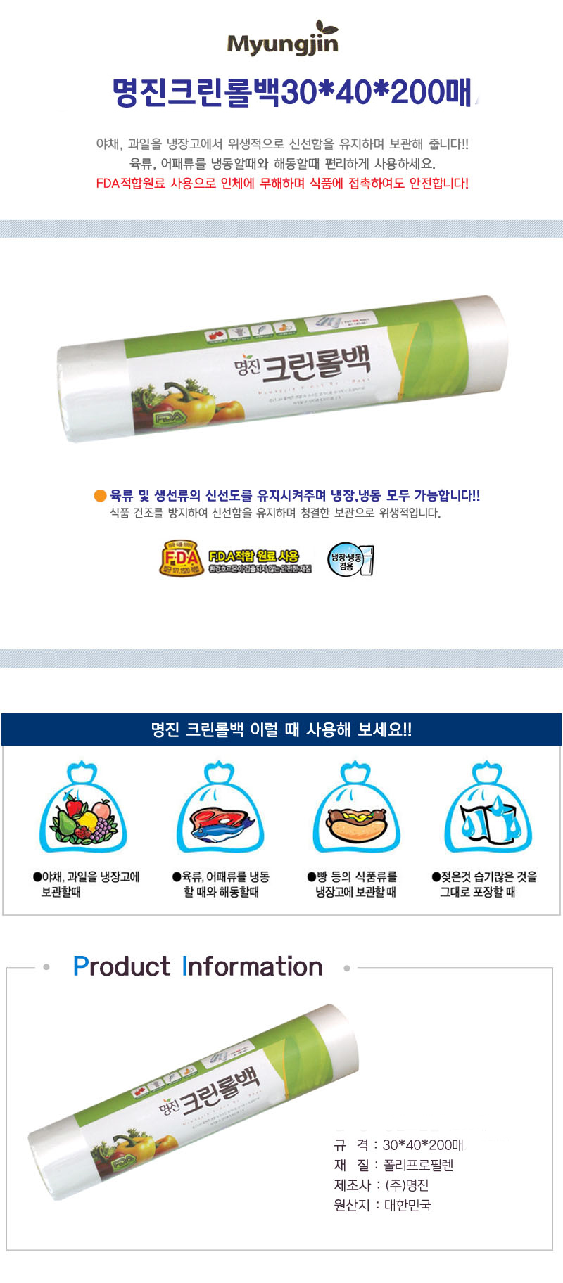 | 품명 및 모델명 | 명진 크린 롤백 일회용 위생백 30x40x200매 비닐백 비닐팩 위생백 위생롤팩 롤백 / 상세정보별도표시 |