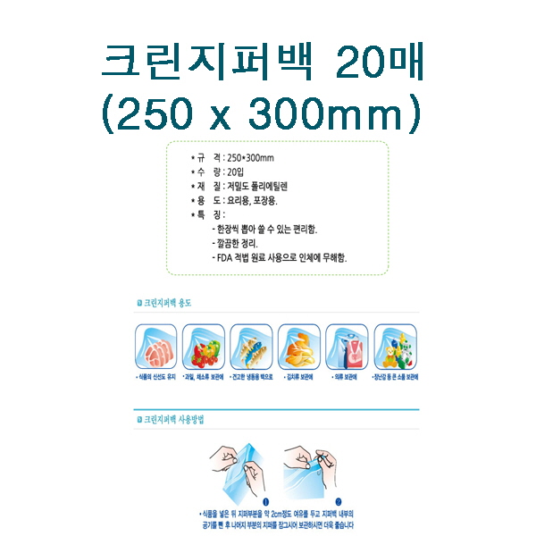 | 품명 및 모델명 | 크린지퍼팩(250x300mm 20매)일회용품 생활잡화 위생팩 / 상세정보별도표시 |