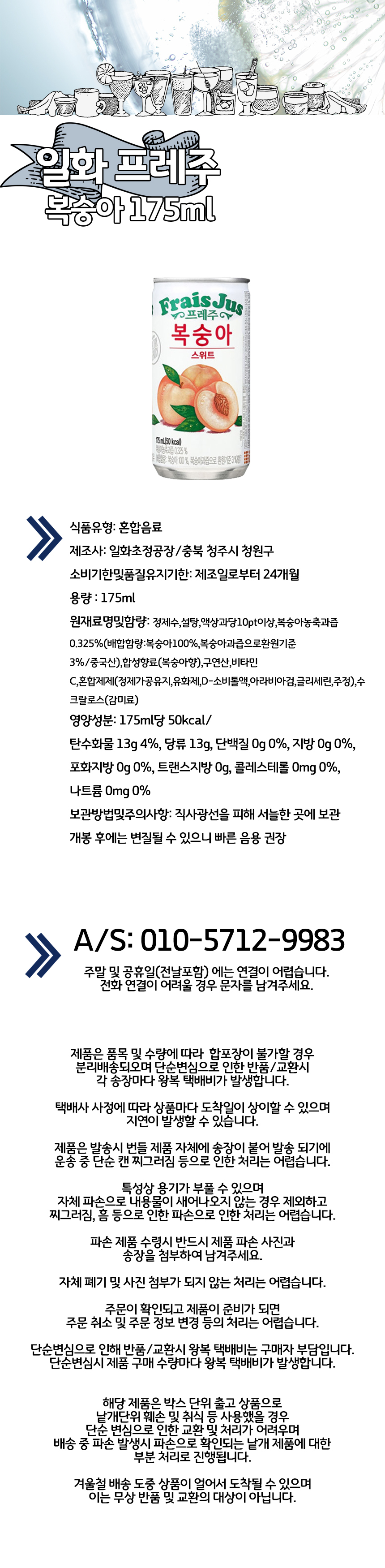 | 포장단위별 내용물의 용량(중량),수량 | 일화 프레주 복숭아 175mlx60캔 |