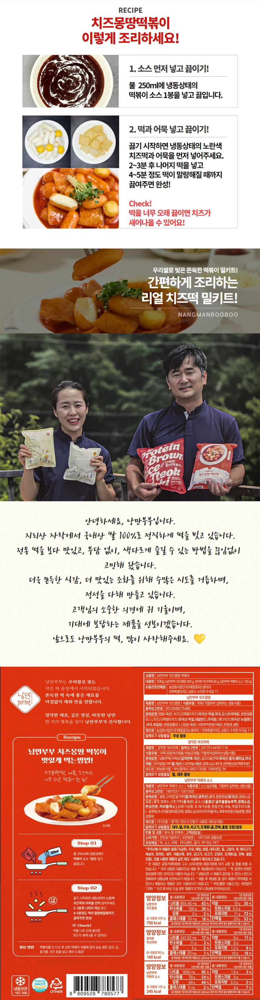 | 원재료 및 함량 | 치즈몽땅떡볶이: 낭만부부치즈몽땅{멥쌀(국산),치즈[모짜렐라치즈(외국산:독일,미국오스트리아동),분말셀룰 로스],치즈[모짜렐라치즈(오국산:독일,네덜란드,미국등),체다치즈(외국산:뉴질랜드 ,미국,독일동),분말셀룰로스],찹쌀(국산),서양호박분말(국산),천일명,설탕},정직한 부산어묵{어묵(유탕처리제품/바살균제품/가열하여성취하는냉동식품) 냉동연육[아육살(갈치연육: 국산),실꼬리동연육(외국산:중국,베트남,러시 아동).]우리밀말가루(밀: 국산),다진마늘(국산),정제소금대두유,천연향신료(백후추분)},낭만부부떡볶이소스{.설당,고추장(밀가루(밀:미국산,호주산), 물엿,혼합양념(중국산), 정제소금, 밀쌀].물엿,정제수,고춧가(중국산),굴소스[홍콩산:굴추출물농축액,정제소금, 변성전분,카라멜색소],당류가공풍,과·채가공품,혼합간장, 마늘,복합조미식품, L-글루탐산나트륨(향미증진제),정제소금,파프리카추출색소,흑후추분말,마늘분말,영양화제}/ 모짜렐라치즈가래떡:멥쌀(국산) 56%,자연치즈(외국산:독일,미국,오스트리아등)43%(자연치즈99%:모짜렐라치즈/우유,식염,유산균배양액,염화칼슘,유응고효소),분말셀룰로오스,천일염(국산) |