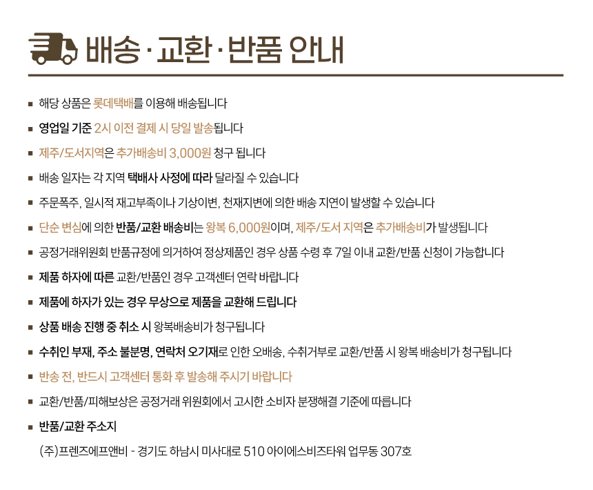위의 배송기간은 표준 배송 기간이며 재고의 유무, 배송지역, 택배사 사정에 따라 배송기간이 추가 소요될 수 있습니다.