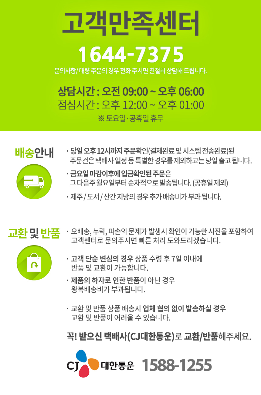 | 제조년월일, 소비기한 또는 품질유지기한 | 본 상품의 생산일자 또는 소비기한이 입고일마다 다르므로 정보제공이 어렵습니다. 정확한 소비기한 일자는 고객센터로 전화주시면 안내해드리겠습니다. |